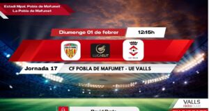 Segueix en directe el partit entre el CF Pobla de Mafumet i la Unió Esportiva Valls a partir de les 12.15h des...
