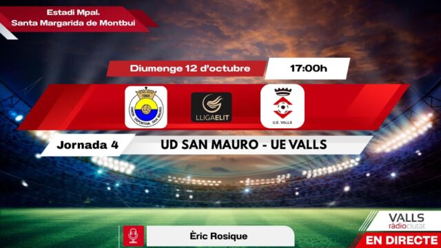 Segueix en directe el partit entre la Unión Deportiva San Mauro i la Unió Esportiva Valls a partir de les 17.00h hores des del Municipal de Santa Margarida de Montbui. Aquest diumenge et portem la jornada 4 de la Lliga Elit a través del nostre web valls.radiociutat.com i Youtube Live amb la narració d’Èric Rosique.