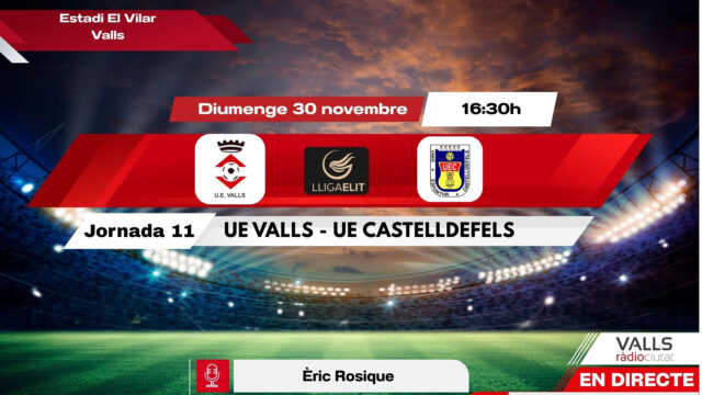 Segueix en directe el partit entre la Unió Esportiva Valls i el Castelldefels a partir de les 16.30h des de l’estadi del Vilar. Aquest diumenge et portem la jornada 11 de la Lliga Elit a través del nostre web valls.radiociutat.com i Youtube Live amb la narració d’Èric Rosique.
