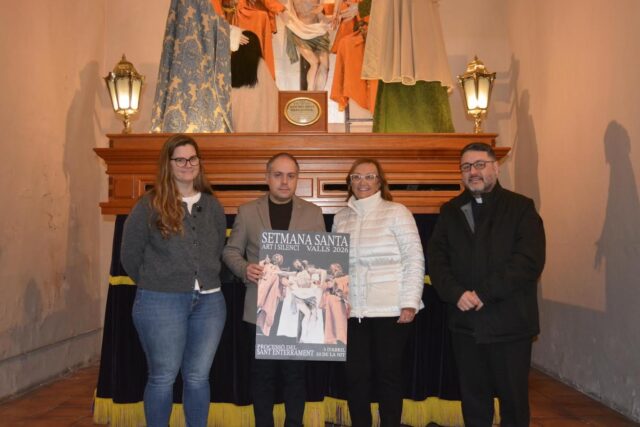 La Setmana Santa 2026 a Valls ja té cartell oficial. L’església de Sant Joan Baptista ha acollit, aquest Dimecres de Cendra, dia 18 de febrer, la presentació de la imatge gràfica promocional, en un acte que s’ha celebrat a la capella que acull el misteri del Davallament de la Creu i que ha comptat amb la participació de Pol Montserrat, el president de l’Agrupació de Germandats i Confraries de Setmana Santa a Valls; mossèn Víctor Mosquera, el rector de la parròquia; Rosa Maria Domingo, representant de la Confraria del Davallament de la Creu, i Míriam Estrem, autora i guanyadora del concurs de cartells.