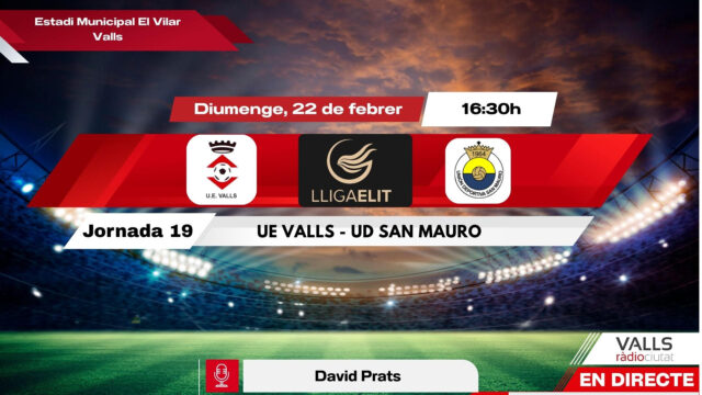 Segueix en directe el partit entre la Unió Esportiva Valls i la Unió Esportiva San Mauro a partir de les 16.30h des de l’estadi del Vilar. Aquest diumenge et portem la jornada 19 de la Lliga Elit a través del nostre web valls.radiociutat.com i Youtube Live amb la narració de David Prats.